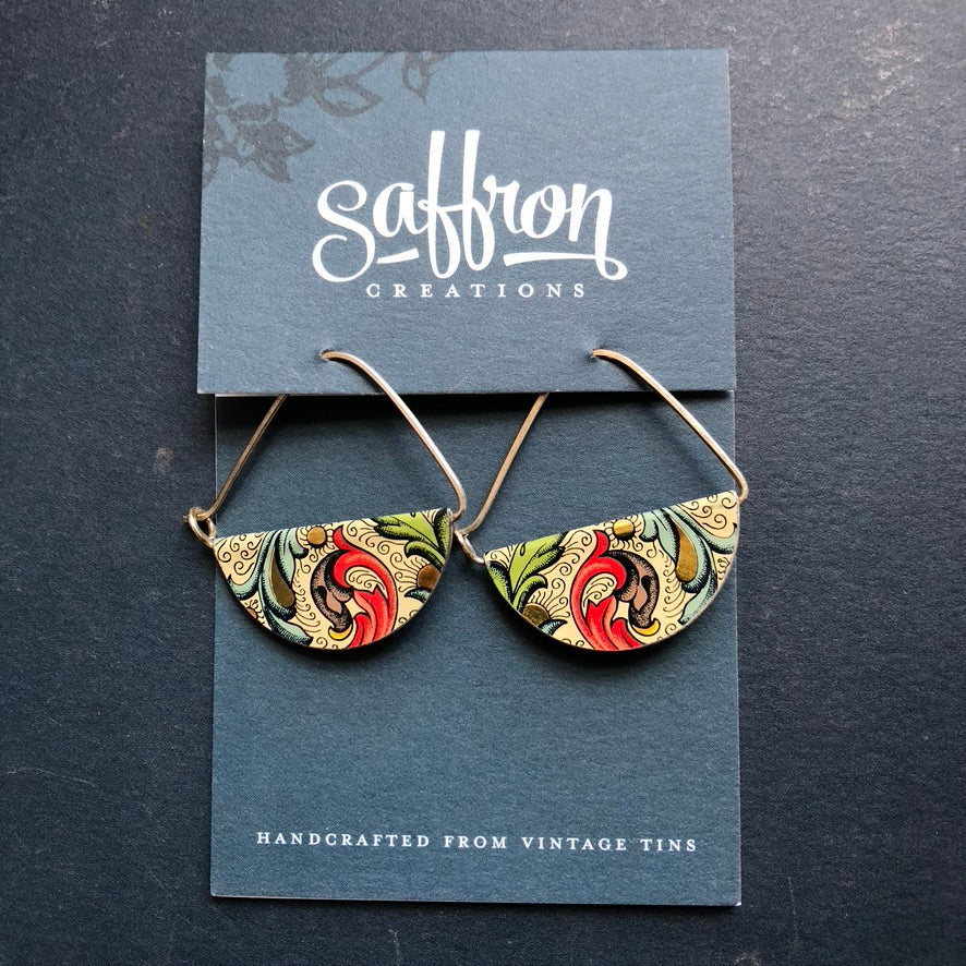 This lovely, lightweight jewelry is handcrafted from recycled vintage tins. Most of these intricately printed tins were manufactured in England in the 1960s and 70s to contain items such as tea and cookies.