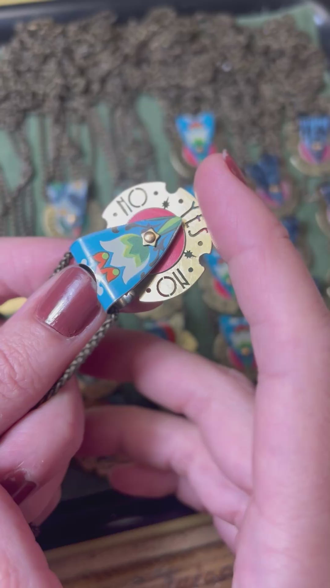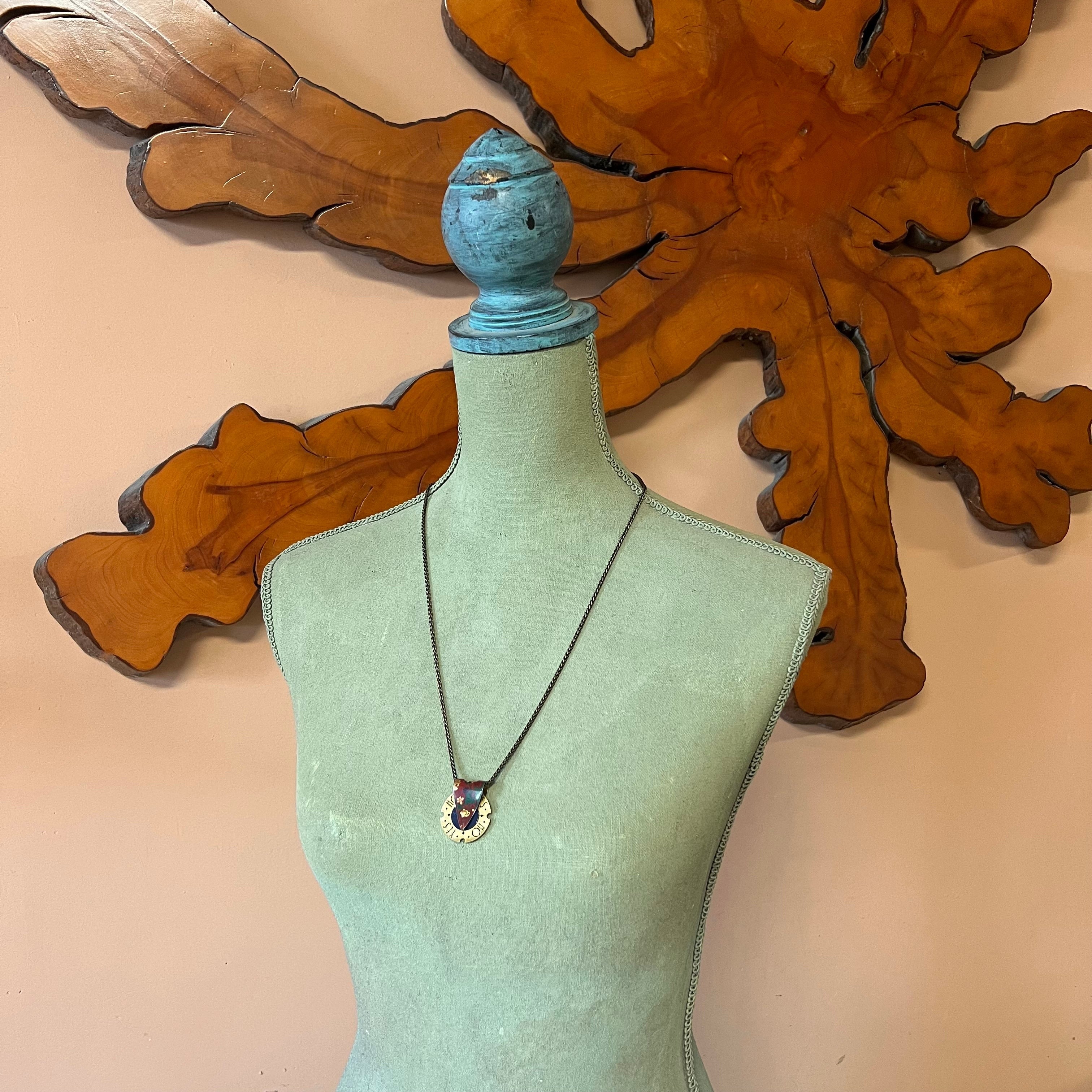 This colorful pendant is cut from a vintage tin and the design inspired by the Ouija board indicator. A brass disc spins freely, embellished with Art Deco lettering and the sweetest starbursts, waiting to give you the answers you seek.