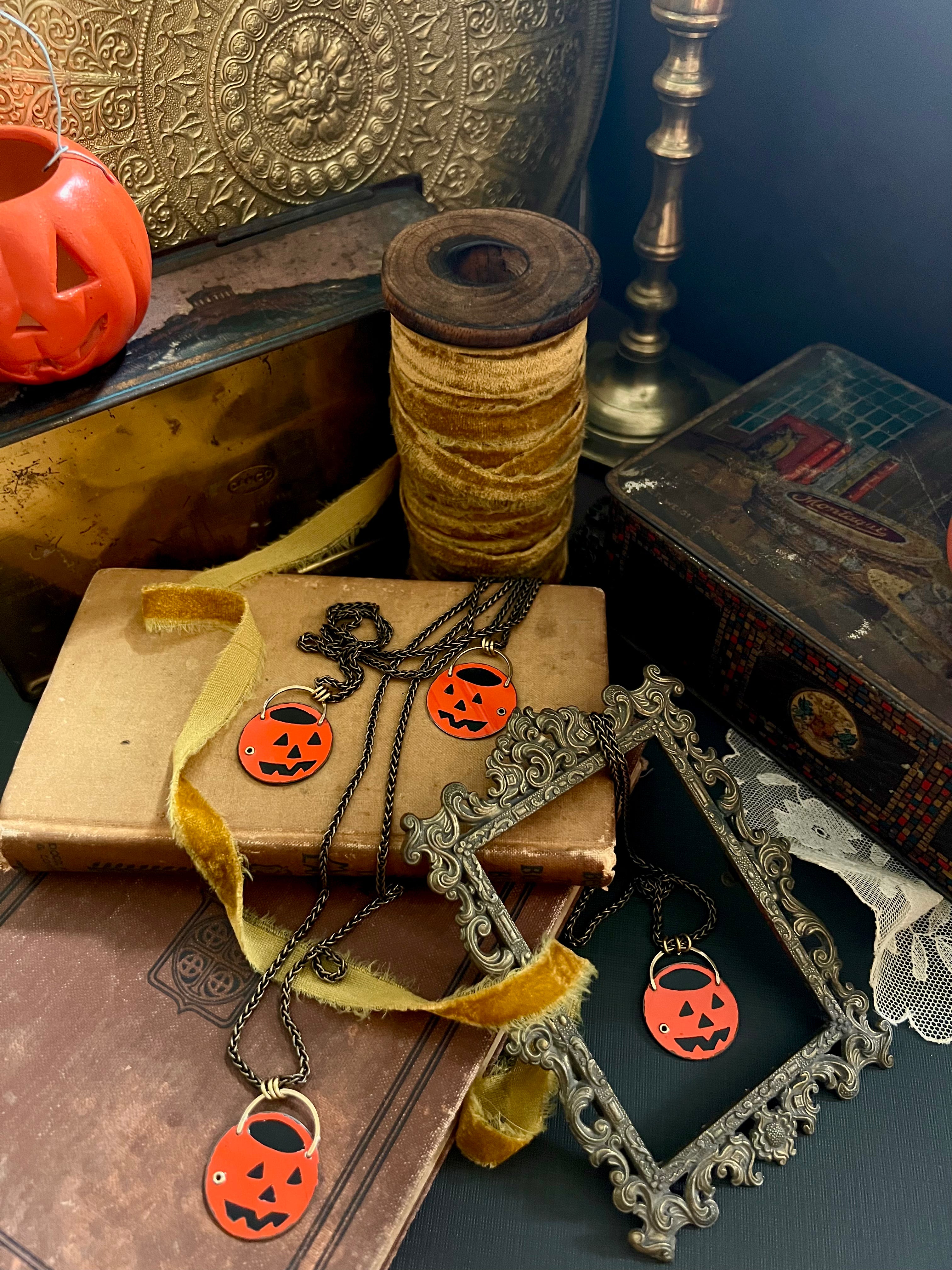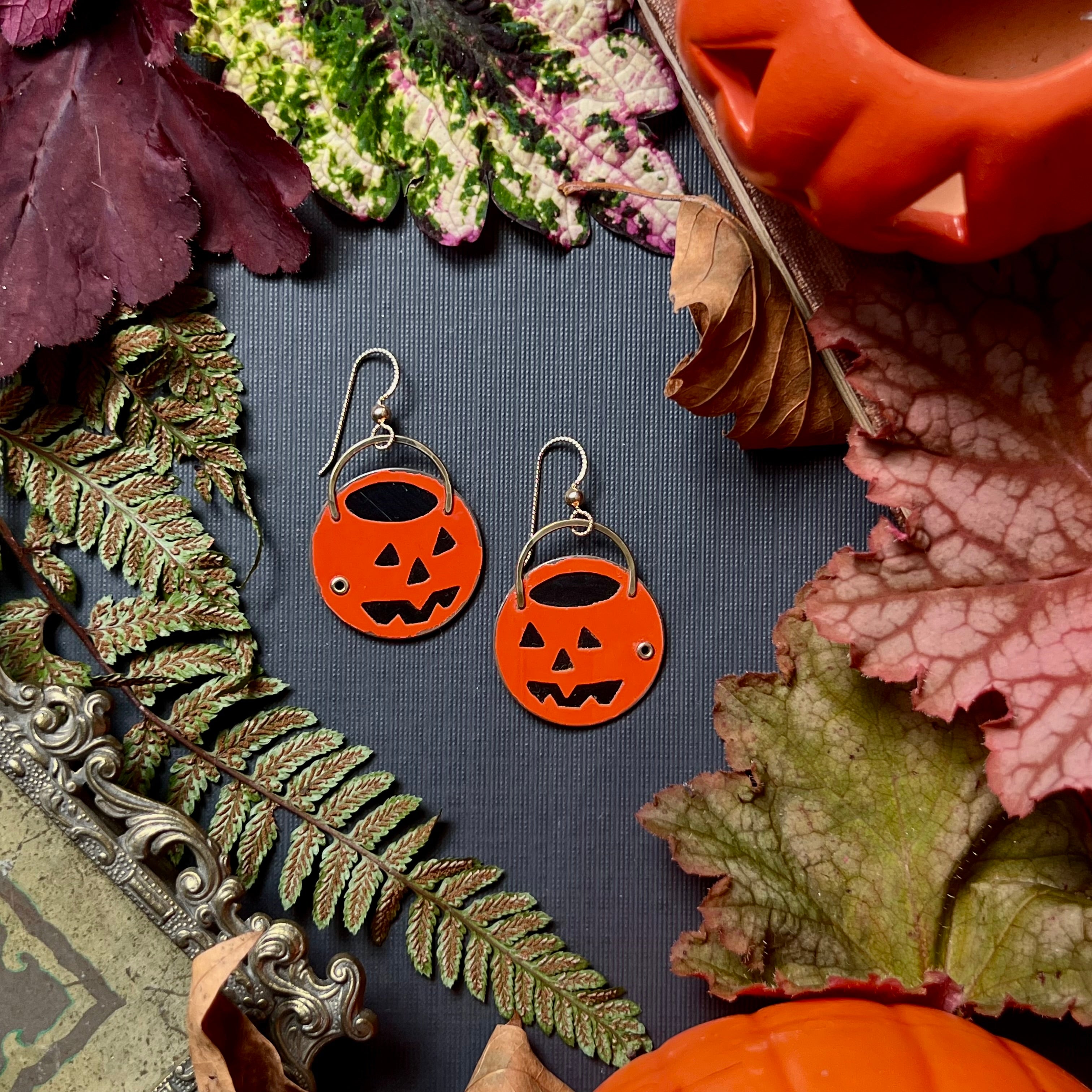 These earrings are handmade from a vintage Reese’s tin! They're designed to look like the nostalgic plastic jack o’lantern buckets for trick or treating. They're sure to become a favorite Halloween tradition that you look forward to wearing every spooky season!