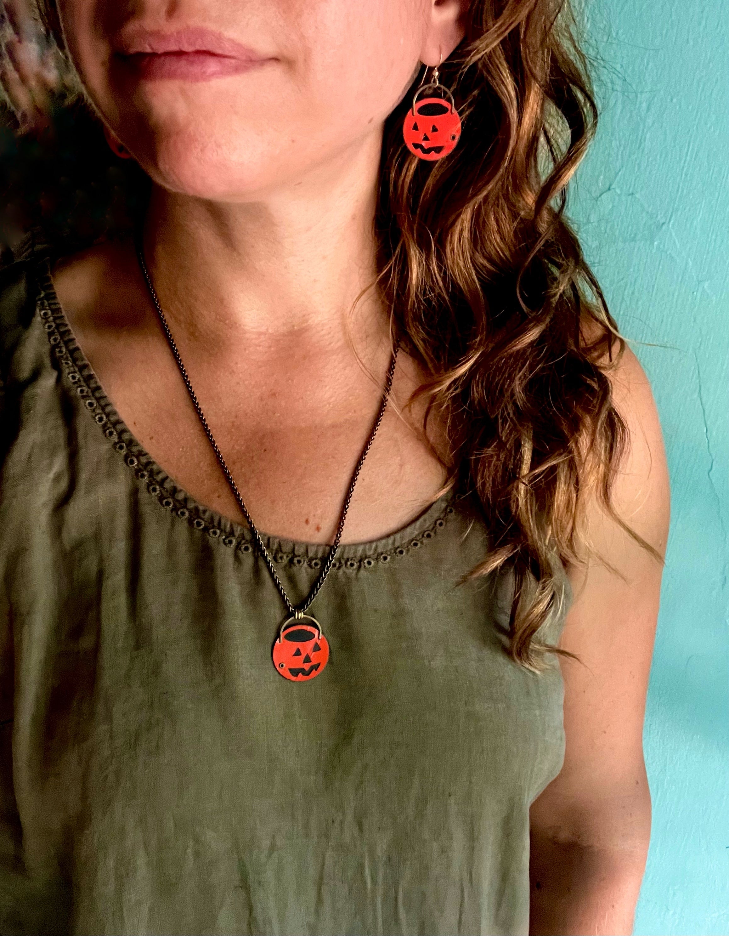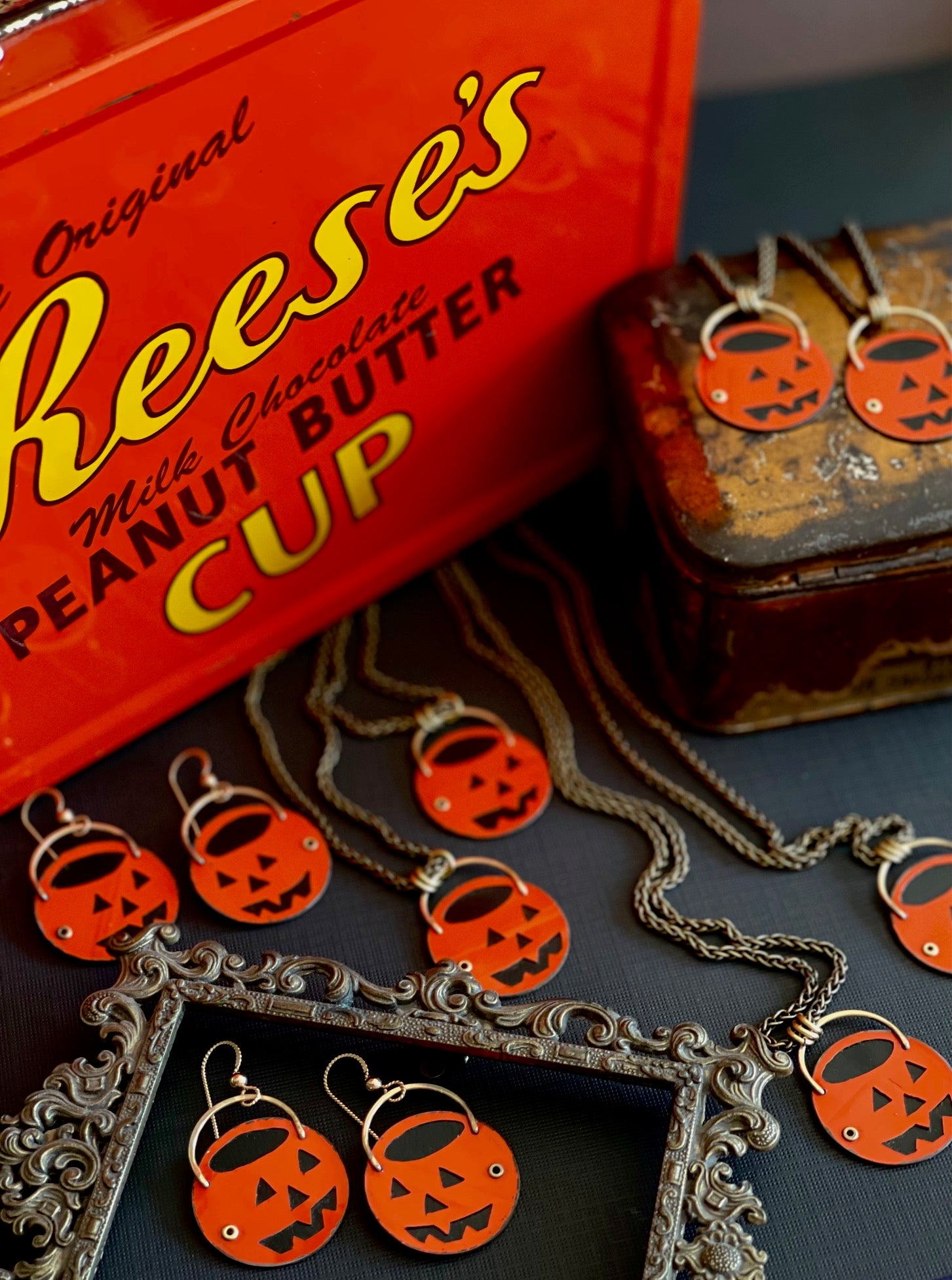 This necklace is handmade from a vintage Reese’s tin! It’s designed to look like the nostalgic plastic jack o’ lantern buckets for trick or treating. It's sure to become a favorite Halloween tradition that you look forward to wearing every spooky season!