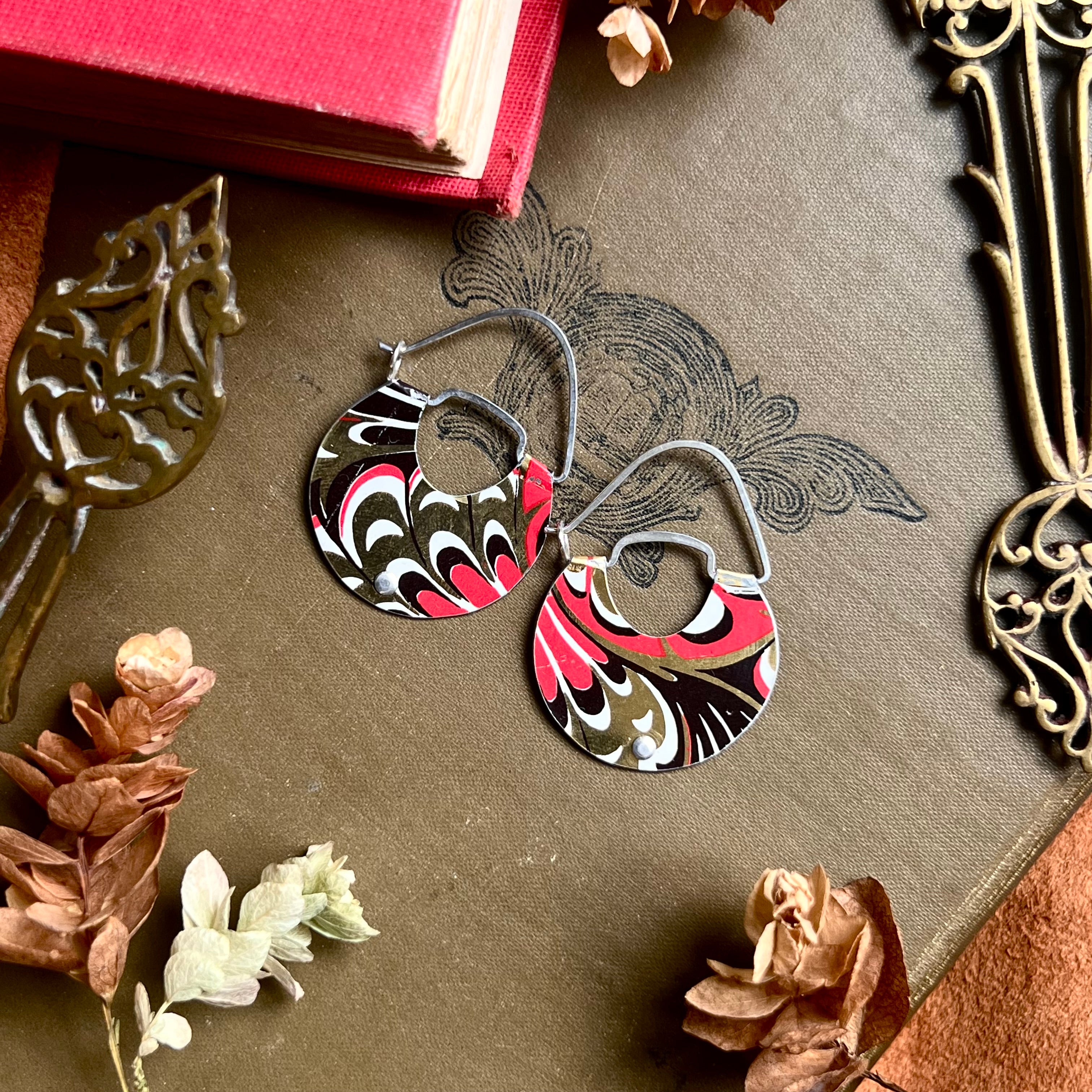 Dramatic red and black with reflective gold. These double-sided hoop earrings are beautiful from every angle. Riveted with tiny eyelets and embellished with a forged ear wire that latches closed securely. Sterling silver. 1 1/2" long and 1 1/8" wide. Pattern placement will vary.